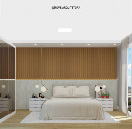 Projeto de interiores. Nesse projeto criamos uma base neutra, com tons de bege, branco e madeira. A grande aposta foi o painel em ripas de madeira louro freijó com efeito marcante e a cabeceira estofada com iluminação indireta. Uma composição harmônica com ares contemporâneos.+Detalhes
