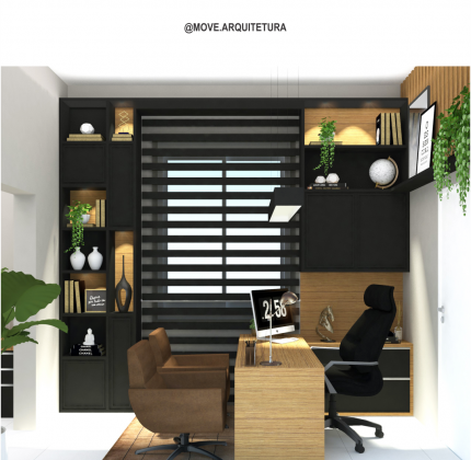 Projeto de interiores. O projeto para esse consultório traz além de funcionalidade, beleza em cada detalhe. A madeira nos detalhes contrasta com a marcenaria em MDF preto e harmoniza com a iluminação gerada nos espaços. As linhas retas trazem a sobriedade e serenidade no ambiente médico.+Detalhes