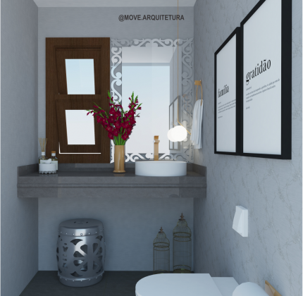 Projeto de interiores. O lavabo é um cantinho da casa que com certeza merece toda atenção! Uma proposta que mescla o clássico x moderno. Os tons em cinza predominam no espaço e os metais em dourado são responsáveis por realçar os detalhes. Conferindo ousadia ao espaço.+Detalhes
