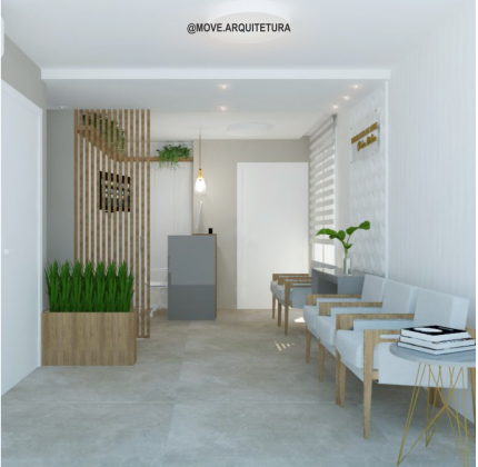 Projeto de interiores comercial. Projeto desenvolvido para um consultório médico, com uma proposta mais clean o branco predomina no espaço, a madeira é responsável por quebrar a frieza e conferir a sensação de aconchego. O rebaixo de gesso encaminha ao acesso.+Detalhes