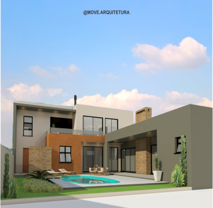 Projeto de construção residencial. Projeto de residência unifamiliar que tem como princípio ressaltar o contraste entre as formas e a riqueza dos espaços e materiais, utilizando recursos como, linhas retas, esquadrias pretas e espaços amplos com pé direito alto, conferindo modernidade ao projeto.