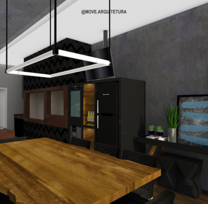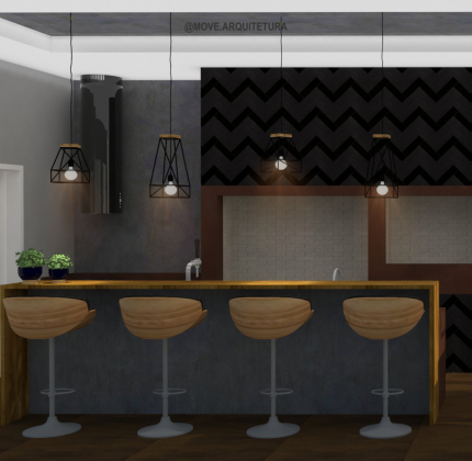Projeto de interiores. Nesse espaço pensamos em algo bem urbano e contemporâneo, toques de preto inclusive na paginação zig zag alternando o revestimento brilho e fosco aliado a madeira rústica e textura de cimento queimado conferindo contraste visual.