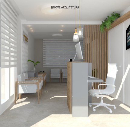 Projeto de interiores comercial. Projeto desenvolvido para um consultório médico, com uma proposta mais clean o branco predomina no espaço, a madeira é responsável por quebrar a frieza e conferir a sensação de aconchego. O rebaixo de gesso encaminha ao acesso.