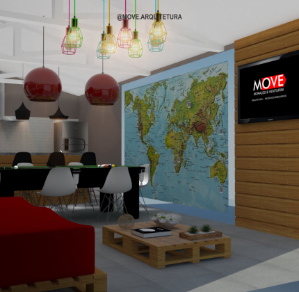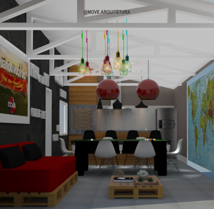 Projeto de interiores comercial. Projeto desenvolvido para o CCAA Dom Pedrito -RS. Um espaço dinâmico para recreação e área de cooking. A parede em lousa, cria uma atmosfera divertida e a mesa de sinuca ganha um tampo em madeira para ser utilizada eventualmente otimizando o espaço.