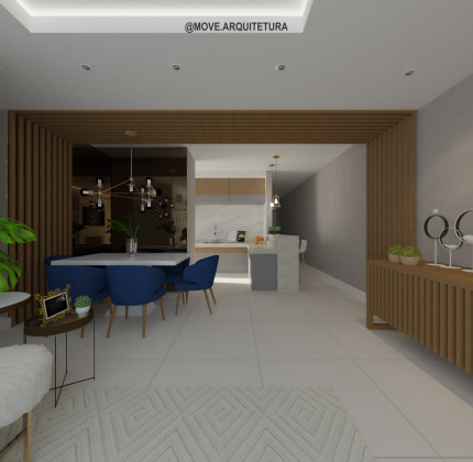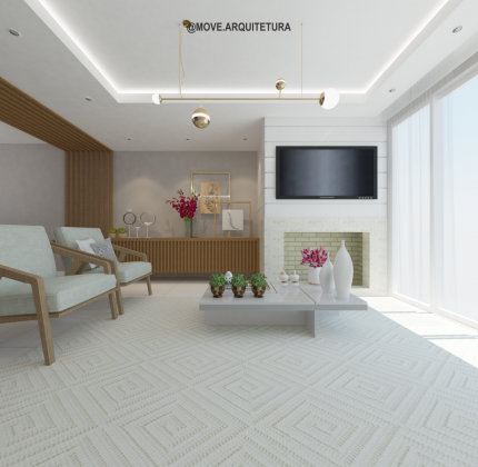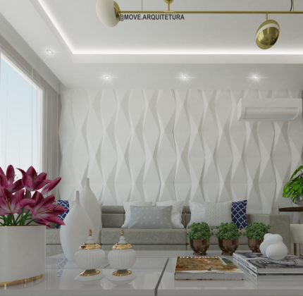 Projeto de interiores. Outro ângulo desse projeto. Tons neutros e suaves, atmosfera contemporânea e estilo clean. Assim foi concebido o conceito desta sala. A segregação de atividades estar/ jantar acontece através do painel ripado teto e parede. O destaque da sala fica por conta do 3D Origami da Castelatto.