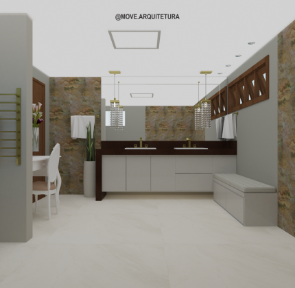 Projeto de interiores desenvolvido para a suíte do casal. Uma proposta diferente, um estilo mais \"over\" mesclado com o clássico, tons e materiais inusitados como a pedra flex que é o grande destaque desse espaço combinado aos metais em dourado tornam esse ambiente único e inusitado.
