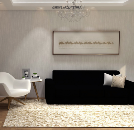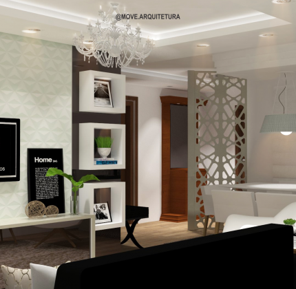 Projeto de interiores. Adotar um estilo mais clean não significa deixar de lado o aconchego. Nesse apartamento utilizamos uma decoração mais neutra com detalhes contemporâneos e o destaque ficou por conta do revestimento 3D diamante e o espelho em bronze que confere luxo ao espaço.